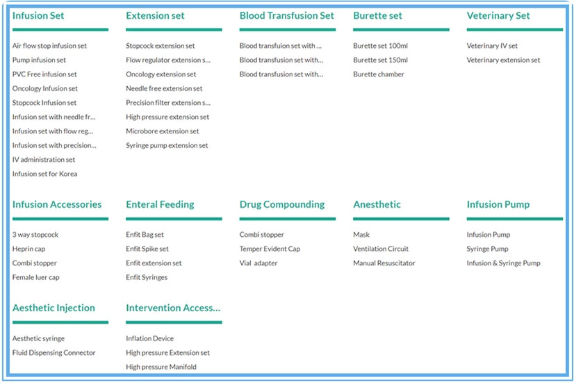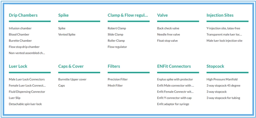2. 組件產品 : 滴注腔,過濾器,尖峰,夾鉗和流量調節(jié)器,閥門,注射部位,魯爾鎖,蓋和蓋,ENFit連接器,旋塞閥
